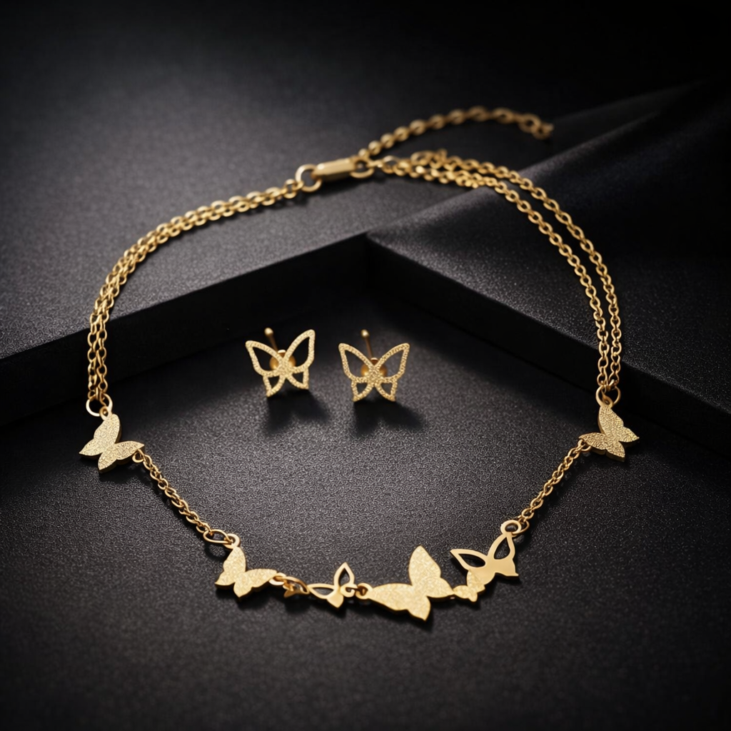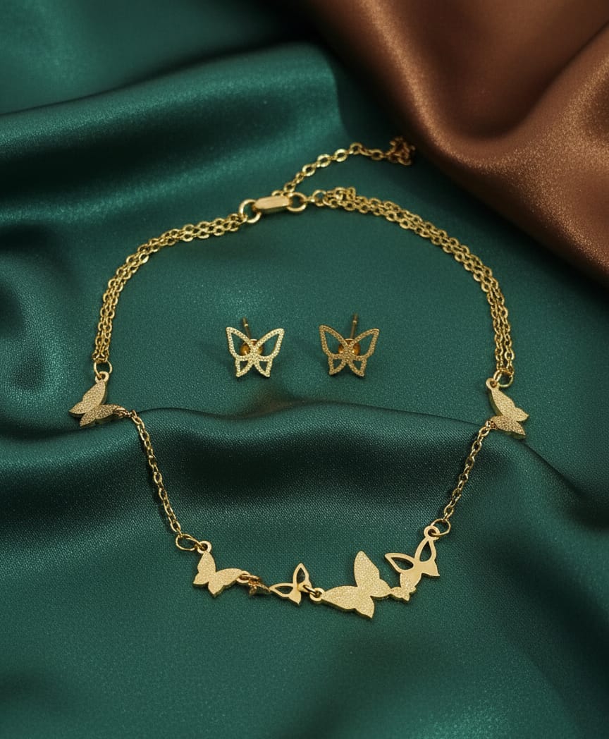 A graceful butterfly-inspired jewelry set featuring a fine golden-tone chain adorned with multiple delicately textured butterfly charms, paired with matching butterfly stud earrings. Lightweight yet eye-catching, this set offers a perfect balance of elegance and softness, ideal for both everyday wear and special occasions.